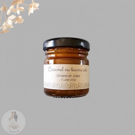 N'oubliez pas de sauvegarder votre personnalisation pour pouvoir l'ajouter au panier. Vous recevrez sous 48h (hors week-end) un visuel à me valider avant toute confection du produit.Petit pot de Caramel au beurre salé au miel personnalisé pour vos invités de mariages, baptêmes et autres événements.