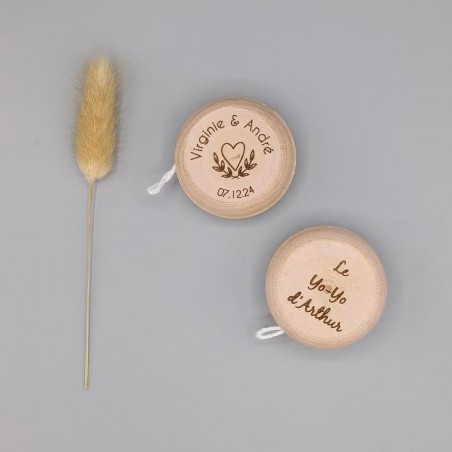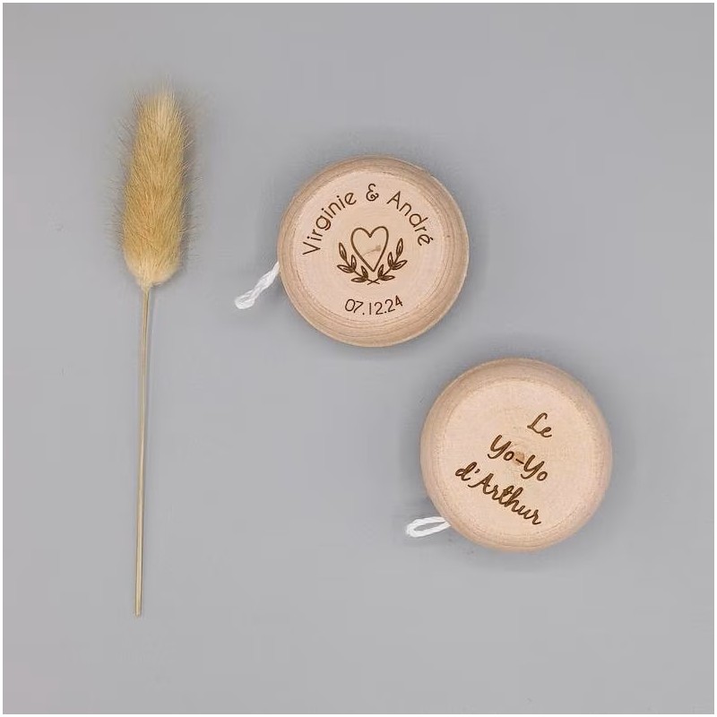 N'oubliez pas de sauvegarder votre personnalisation pour pouvoir l'ajouter au panier. Vous recevrez sous 48h (hors week-end) un visuel à me valider avant toute confection du produit.Yoyo en bois gravé pour gâter vos petits et jeunes invités pour vos Mariages, Baptêmes ou autre événement