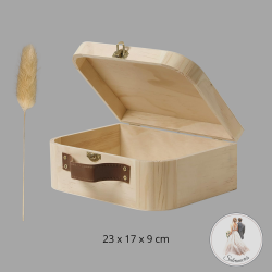 Valise en bois brut : 23 cm de longueur, 17 cm de largeur et 9 cm de hauteur