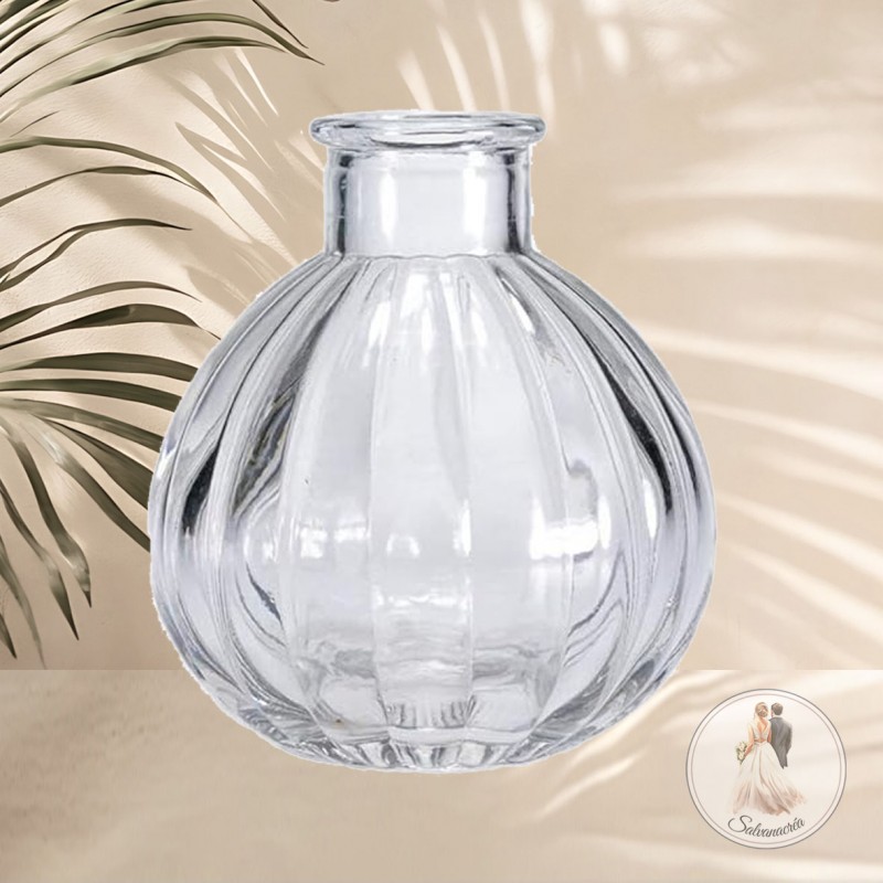 Ce joli petit vase rond rétro bohème en verre épais et côtelé sera sublime en centre de table et en décoration de table. A remplir d'eau, d'eau colorée, de sable, de perles d'eau... Pour y placer de la décoration florale : roses, orchidées, fleurs séchées, pampas, blé, etc. Hauteur 9 cm, diamètre 8,5cm.